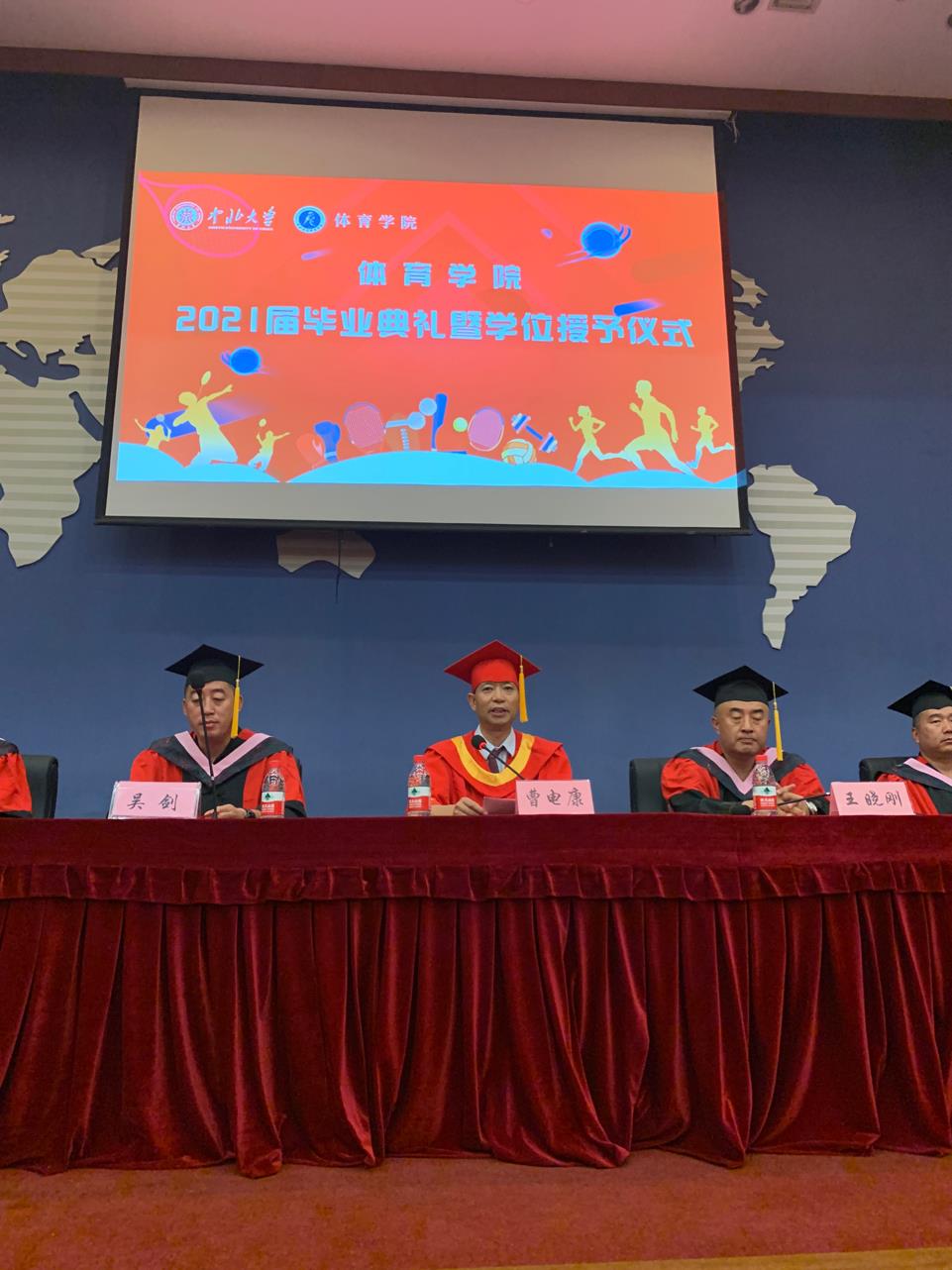 院长曹电康首先致辞,他满怀深情,寄语即将离别的毕业生。他说你们聚在母校是一团火,奔赴大江南北是满天星,期待之情溢于言表。曹院长以30多年体育人的感悟和豪情激励所有毕业生:要争做体育知识与技能的传承者;要争做体育事业的奋斗者;要争做体育精神的传播者;要争做体育梦想的践行者。他还强调体育事业关乎国家前途、民族命运、人民幸福,我们应该为之而奋斗!
