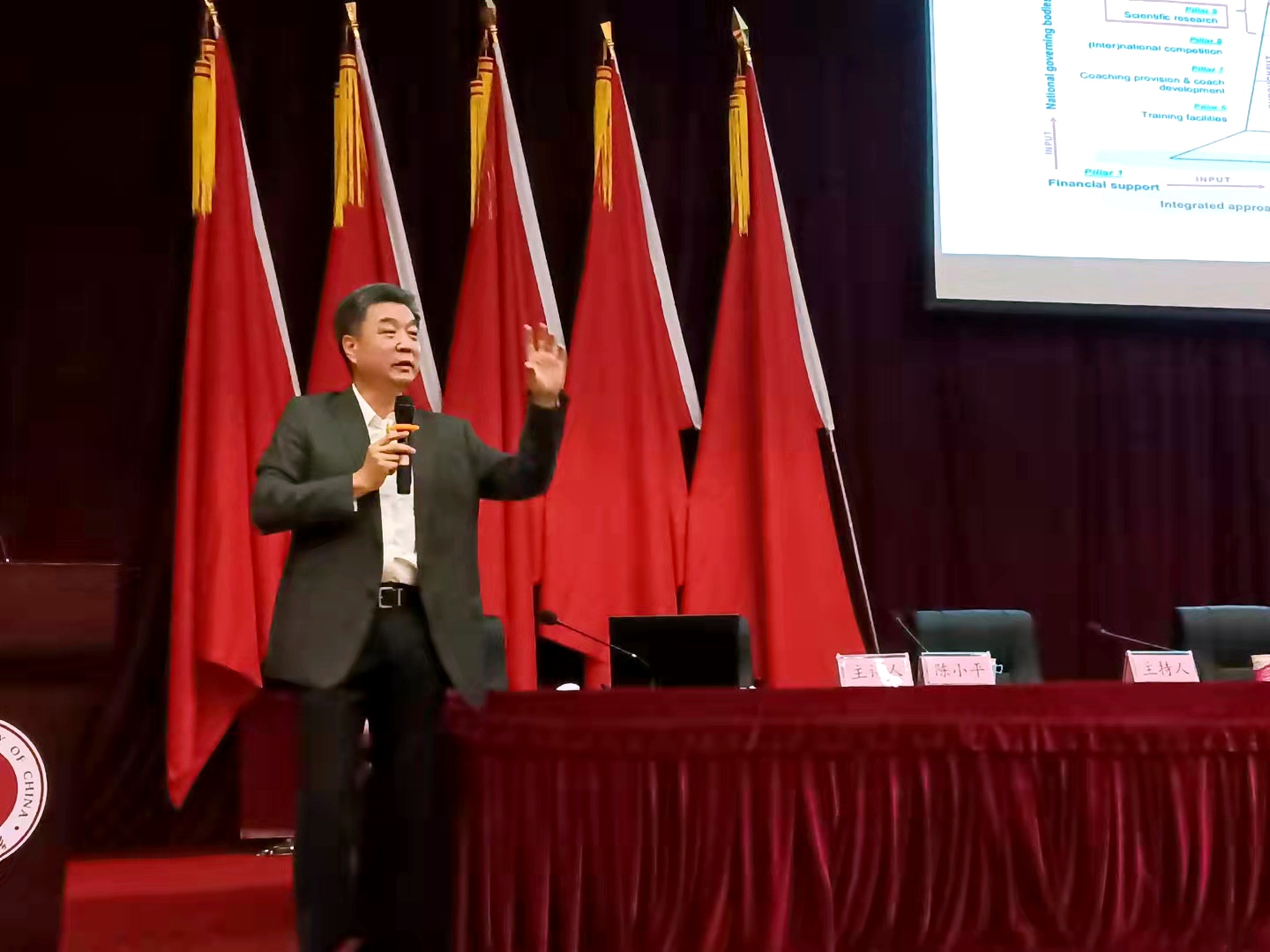 讲座伊始,陈小平教授基于东京奥运会和北京奥运会备战训练的思考开始阐释,从东京奥运会我国运动员与其他国家运动员的表现为切入点展开分析,讲述了竞技运动训练科学化的重要性。同时,陈教授通过对英美等国竞技训练科学化程度的分析使我们认识到我国竞技运动训练的不足。陈教授指出,在21世纪,我国要以新模式、新理论和新方法,即“三位一体”的训练模式来进一步促进竞技运动训练的科学发展。同时,他提出了东京和北京奥运会备战训练科技化路径:要不断学习国外先进训练思想、理论和方法;引进高水平教练员、运动员和科研人员;根据国情进行二次创新;科学的运用到我们国家队的训练中,进而不断提升我国竞技训练科学化水平。