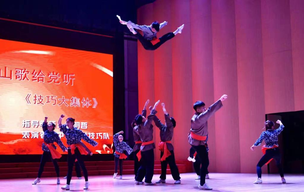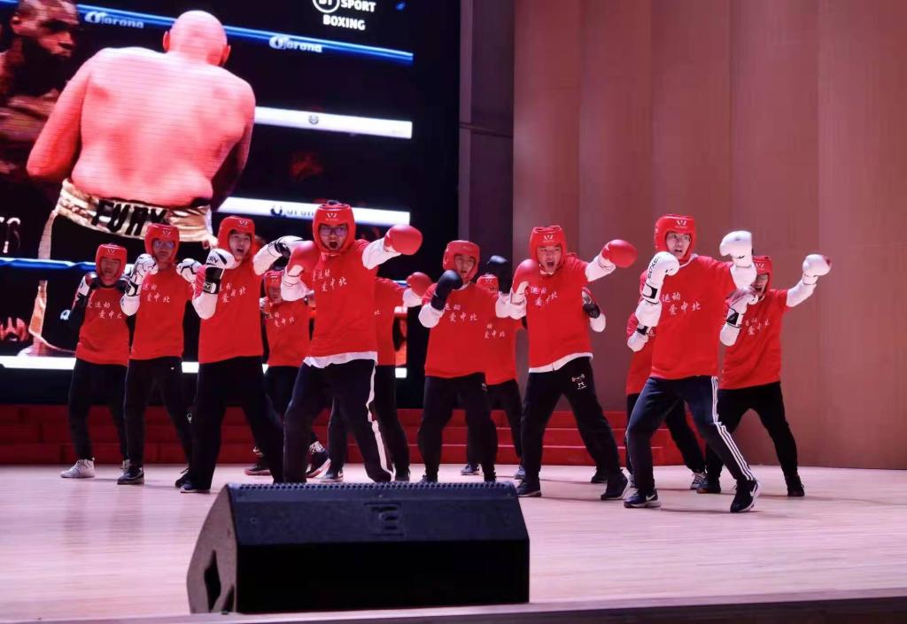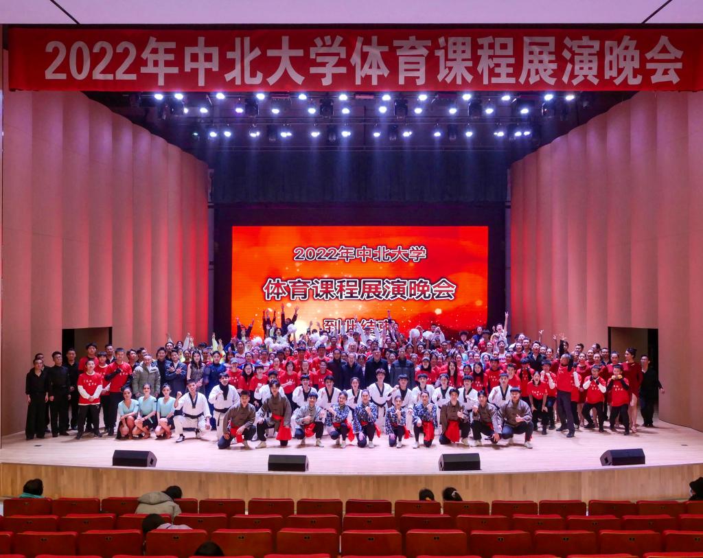 的学校体育丰硕成果。演出结束后,参加展演的领导与演员们合影留念。