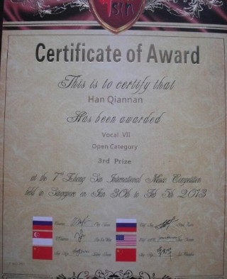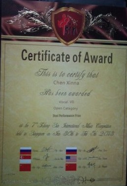 此次国际音乐比赛由新加坡中新国际音乐比赛组委会、新加坡铨达国际音乐机构主办,新加坡星展银行艺术中心、新加坡理工学院大礼堂、新加坡青年音乐厅、俄罗斯国立圣彼得堡音乐学院、俄罗斯国立安德烈夫音乐学院、中国手风琴俱乐部、新加坡齐天音乐学院、新加坡淡马锡理工学院、圣法兰西斯卫理公会教会学校协办,来自世界各地600多名音乐爱好者和专业人士报名参赛。此音乐比赛由俄罗斯功勋艺术家、国际手风琴联盟世界杯(Coupe Mondial)评委、圣彼得堡音乐学院民乐系主任、教授Oleg Shrov(奥列格.夏洛夫)担任比赛委员会主席;新加坡铨达国际集团主席Ron Lau Wee Leng先生担任比赛组委会副主席;俄罗斯人民艺术家、1974年舒曼国际钢琴比赛冠军、肖邦国际钢琴比赛评委、柴格夫斯基国际音乐比赛钢琴评委、圣彼得堡音乐学院钢琴系主任、教授Pavel Egorov(巴维尔.依果诺夫)担任比赛评委会主席;美国音乐教育学会(ATG)会长、美国堪萨斯大学音乐学院教授Joan C.Sommers(琼.索玛斯)担任补赛艺术委员会主席;中国手风琴演奏家、中国手风琴俱乐部主席、中国音协手风琴学会理事、国际比赛评委、副教授夏罡担任比赛组委会秘书长。比赛类别分为有钢琴、声乐、中国民乐、现代键盘器乐、西洋弦乐、西洋管乐,音乐系学生韩世举以古筝曲《西域随想》获得中国民乐古筝组一等奖;韩倩楠以咏叹调《年轻姑娘应该懂得》获得声乐青年组第三名;陈鑫娜以歌曲《我站在铁索桥上》获得声乐青年组优秀奖。