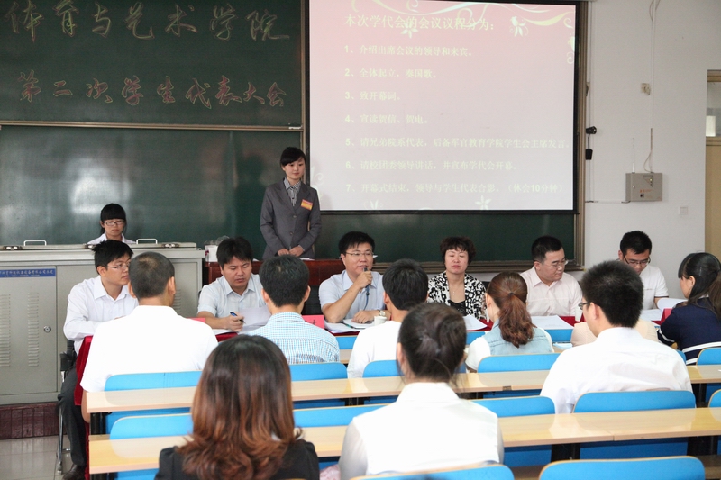 上午八点半主持人宣布预备会议正式开始,大会通过了关于代表资格,大会选举办法、监票人、计票人员名单、以及大会主席团和秘书长名单。短暂的休息过后,大会在庄严地国歌声中正式开始,首先由院党总支书记王琳老师致开幕词;继而由校学生会主席郭文杰宣读贺信,贺电;然后是后备军官教育学院学生会主席代表李亚飞同学兄弟学院学生发言;最后由校团委书记叶玉刚老师讲话,并宣布体育与艺术学院第二次学生会代表大会正式开幕。在会上叶玉刚老师提出当前大学生要加强作风建设,提高学生干部整体素质及服务意识,强化学生干部的维稳作用,引导大学生理性爱国,认真思考如何举办校园文化活动等重要要求,使到场的学生代表受益匪浅,深受启发。