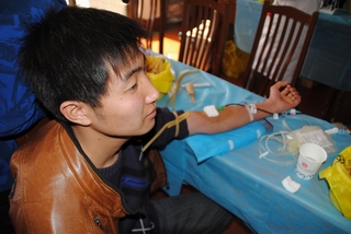 献血场地设在科艺院的大厅内, 本次活动得到了我院领导的大力支持,并把无偿献血活动作为一项经常性活动来抓。10100441团支部成员协助太原市红十字血液人员对献血者进行一系列的相关检测。全校师生也非常积极地报名参与,响应此次活动的倡议,并参与活动。截止到下午一点钟,血车上的血袋就已经满了,而此时来献血的同学仍陆续不断。活动期间,约100多名志愿者加入到此次活动中来,帮助血液中心医务人员处理各方面的事情,每个人都脸上都洋溢着笑容,因为自己做了真正有意义的事情。