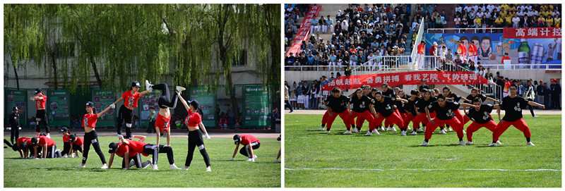啦啦操比赛中,各学院啦啦操表演动作整齐有力、队服缤纷多彩,队员青春活泼,尽情彰显了中北学子的蓬勃朝气和昂扬精神。