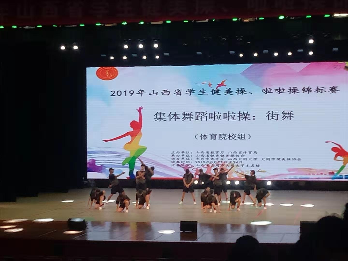 2019年山西省健美操啦啦操锦标赛暨山西省学生健美操啦啦操锦标赛于8月21日至24日,在大同大学本真楼举行。本次比赛由山西省教育厅、山西省体育局主办,山西省健美健美操协会承办,大同市体育局、大同大学、大同市健美操协会协办。共有来自全省大中小学共74支队伍近1300名运动员参赛。比赛项目包含竞技健美操、有氧健身操(舞)、时尚健身课程、街舞、民族健身操(舞)、啦啦操6个竞赛项目。