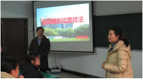 张秋霞老师和张建设老师从“绘图技术、绘图风格、绘图案例”等方面,结合人体解剖标本、体育技术动作与在座的师生们进行了交流和探讨。擅长人体雕塑的张建设老师强调了人体解剖标本绘图的重要意义,他结合自己的创作体会演示了骨骼标志的示意线条应当规整,突出骨骼和肌肉结构细节,并适当运用颜色配布。擅长医学人体绘图的张秋霞老师结合自己多年的创作经验,鼓励同学们大胆发挥想象力,精细刻画运动技术动作,突出肌肉动感等细节描绘。两位老师还现场评阅了学生们的绘图作业,肯定了优点,指出了不足,并指导学生们克服绘图中的困惑。两位专家对我院运动解剖学课程教学辅以人体解剖学绘图形式给予了高度评价。